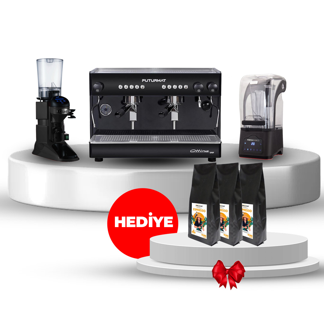 Ottima Futurmat Evo, tam otomatik yapısı ve 2 gruplu sistemiyle hızlı ve tutarlı espresso kalitesi sağlar. Cunill MOVIE TRON, on demand öğütme teknolojisiyle her fincanda taze kahve sunarken; Portabianco dijital bar blender, gürültü önleyici kapağı sayesinde yoğun alanlarda konforlu bir çalışma ortamı yaratır.