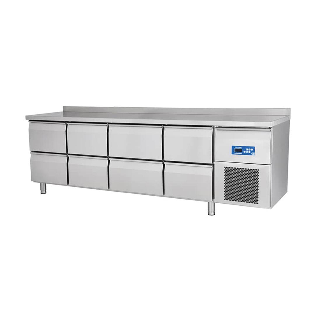 HACCP dijital kontrol paneli, yüksek verimli Mono-Block soğutma sistemi gibi özelliklere sahip olan Öztiryakiler 8 Çekmeceli Yatay Tip Buzdolabı, opsiyonel olarak gemi tip ayak veya hareketli tekerlek seçeneklerine de sahip.